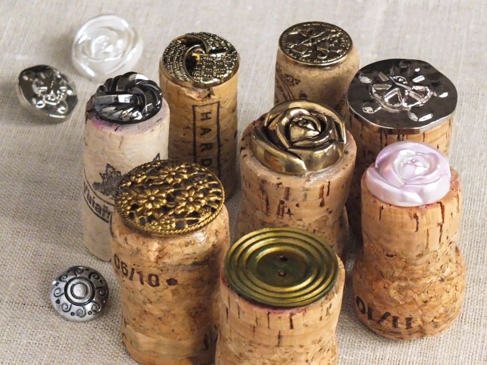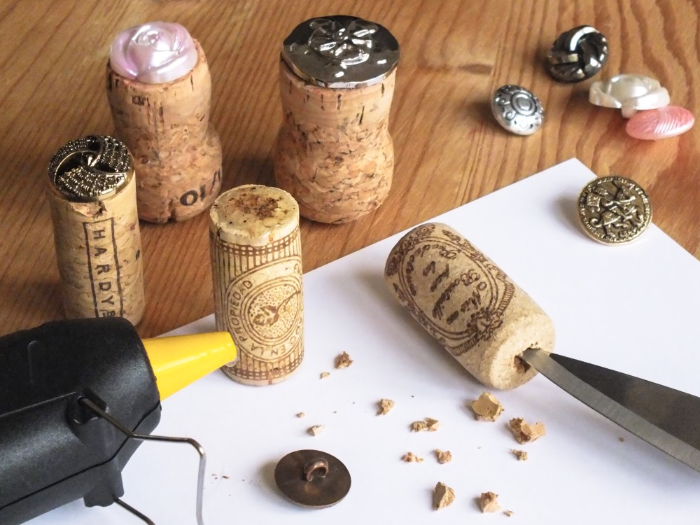 Pro výrobu razítka postačí korkové špunty. Do každého korku vyvrtejte ostrým nožem otvor pro ouško knoflíku.